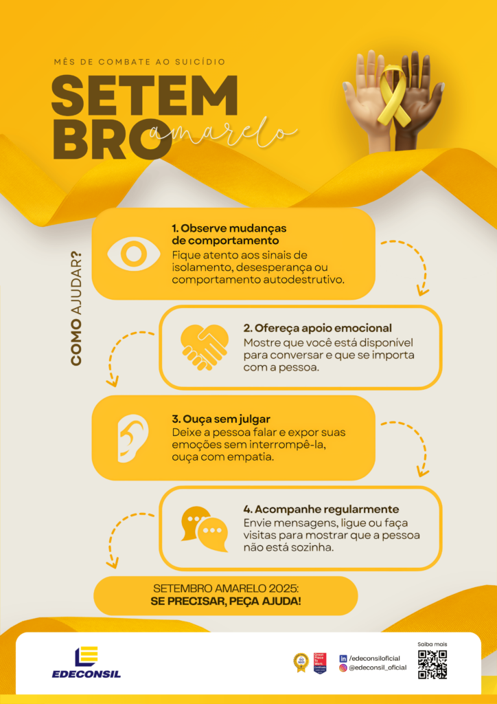 Setembro Amarelo é um convite para falarmos abertamente sobre saúde mental e sobre a importância de cuidar uns dos outros. A cada mensagem, a cada conversa, a gente pode abrir espaço para ouvir sem julgamentos, reconhecer sinais de sofrimento e oferecer apoio. Muita gente enfrenta momentos difíceis em silêncio, e a simples atitude de perguntar: “Como você está realmente?” pode fazer a diferença entre alguém se sentir visto ou isolado.